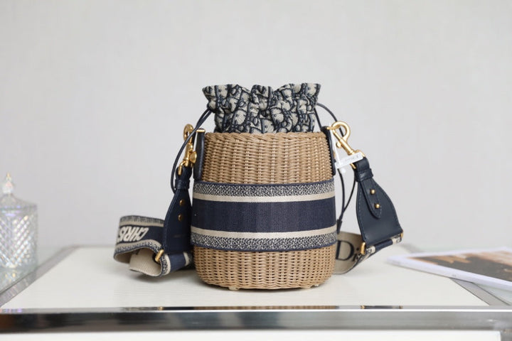 BUCKET BAG 19 IN BLACK OBLIQUE JACQUARD AND BEIGE WICKER