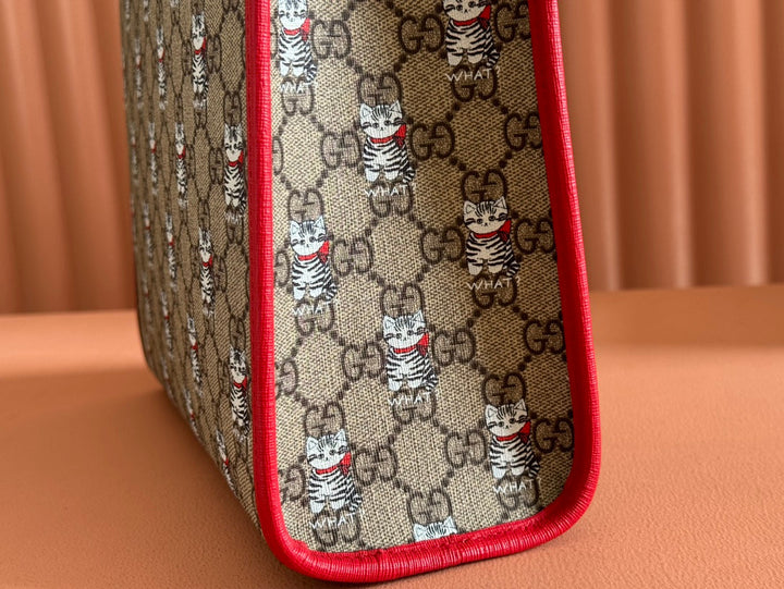 CHILDREN'S PRINTED CAT TOTE BAG 28.5 IN BEIGE AND DARK BROWN GG CANVAS RED TRIM