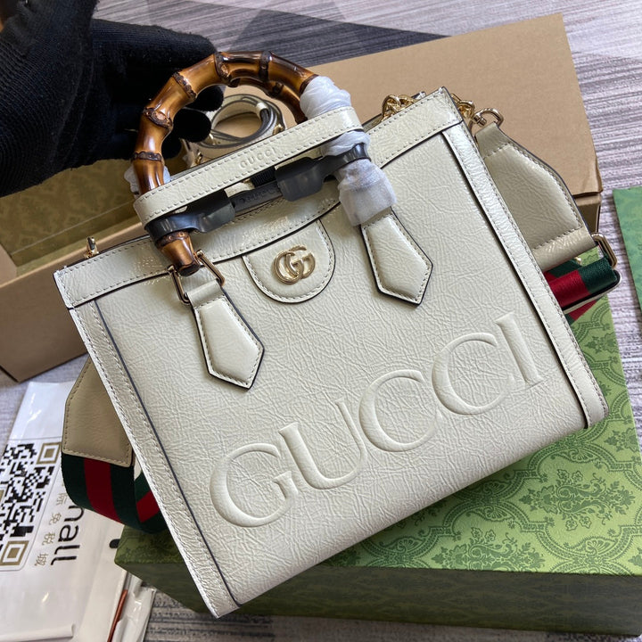 DIANA SMALL TOTE BAG 27 WITH WEB IN WHITE LACQUER CALFSKIN BAMBOO HANDLE
