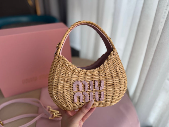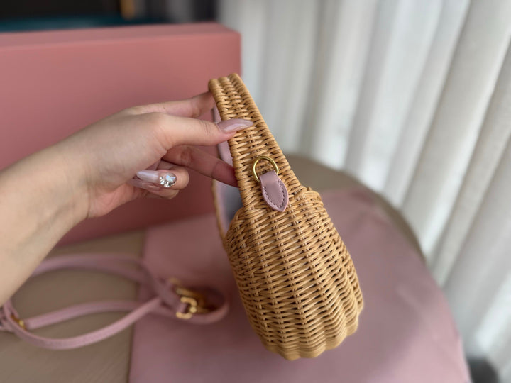 WANDER WICKER HOBO BAG 20 IN BROWN HANDWOVEN WITH PINK CALFSKIN LOGO
